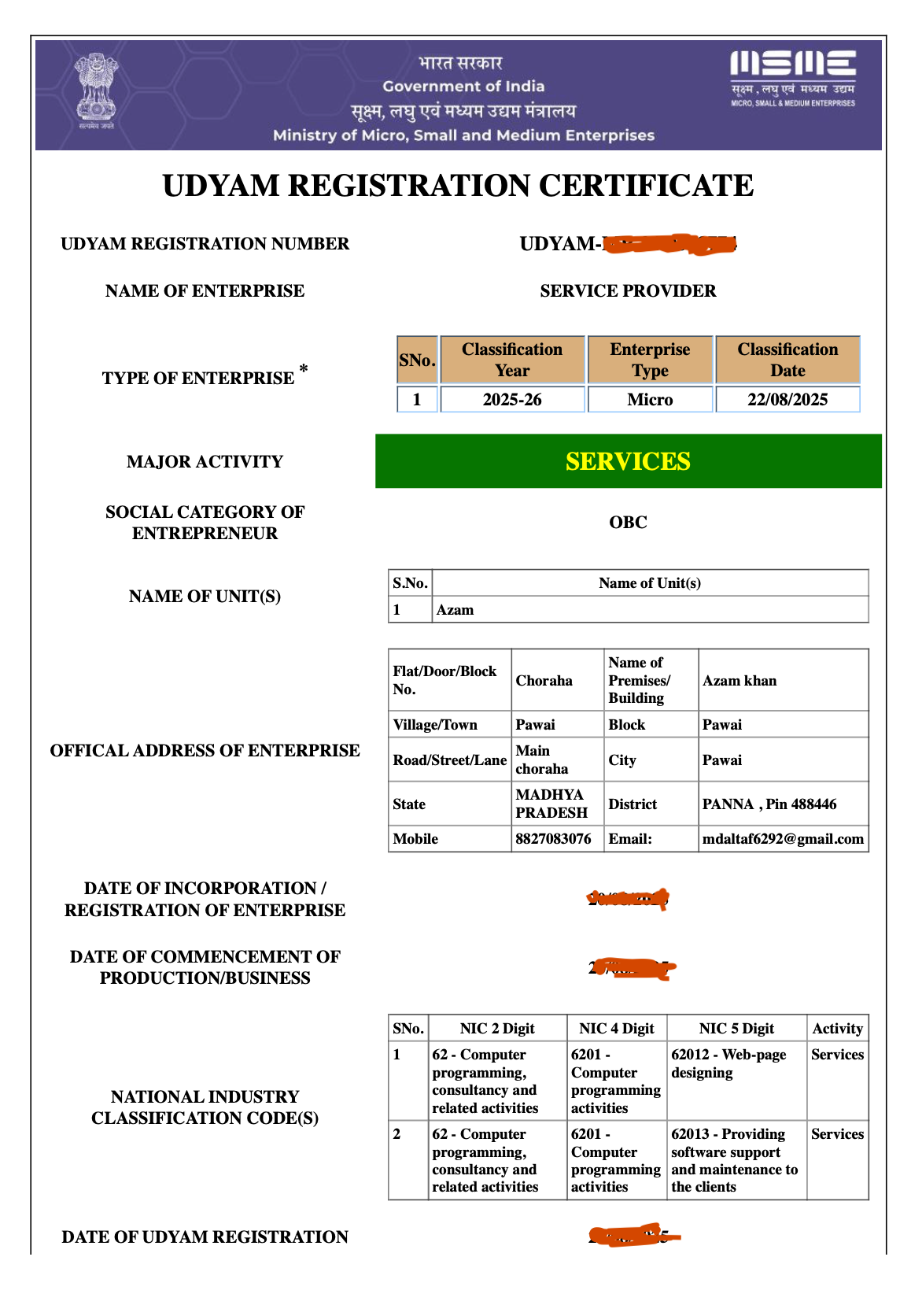 This certification strengthens my official status for Business/Website Development under the Government of India, providing high credibility for my freelance work.